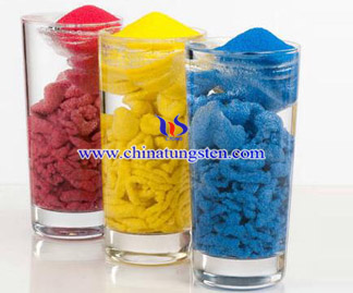 上圖從左往右分別是藍色氧化鎢粉末、樣品、桶裝産品圖片。